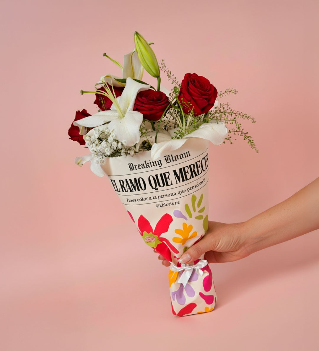 - Envoltura: Papel decorativo con la frase “El ramo que mereces”.