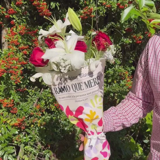 Las rosas, símbolo universal del amor, la belleza y la gratitud, se combinan con los lirios, conocidos por representar pureza, renovación y nuevos comienzos. Juntos crean un ramo que expresa emociones sinceras, perfecto para celebrar, agradecer o sorprender a alguien que merece un gesto lleno de intención y delicadeza.