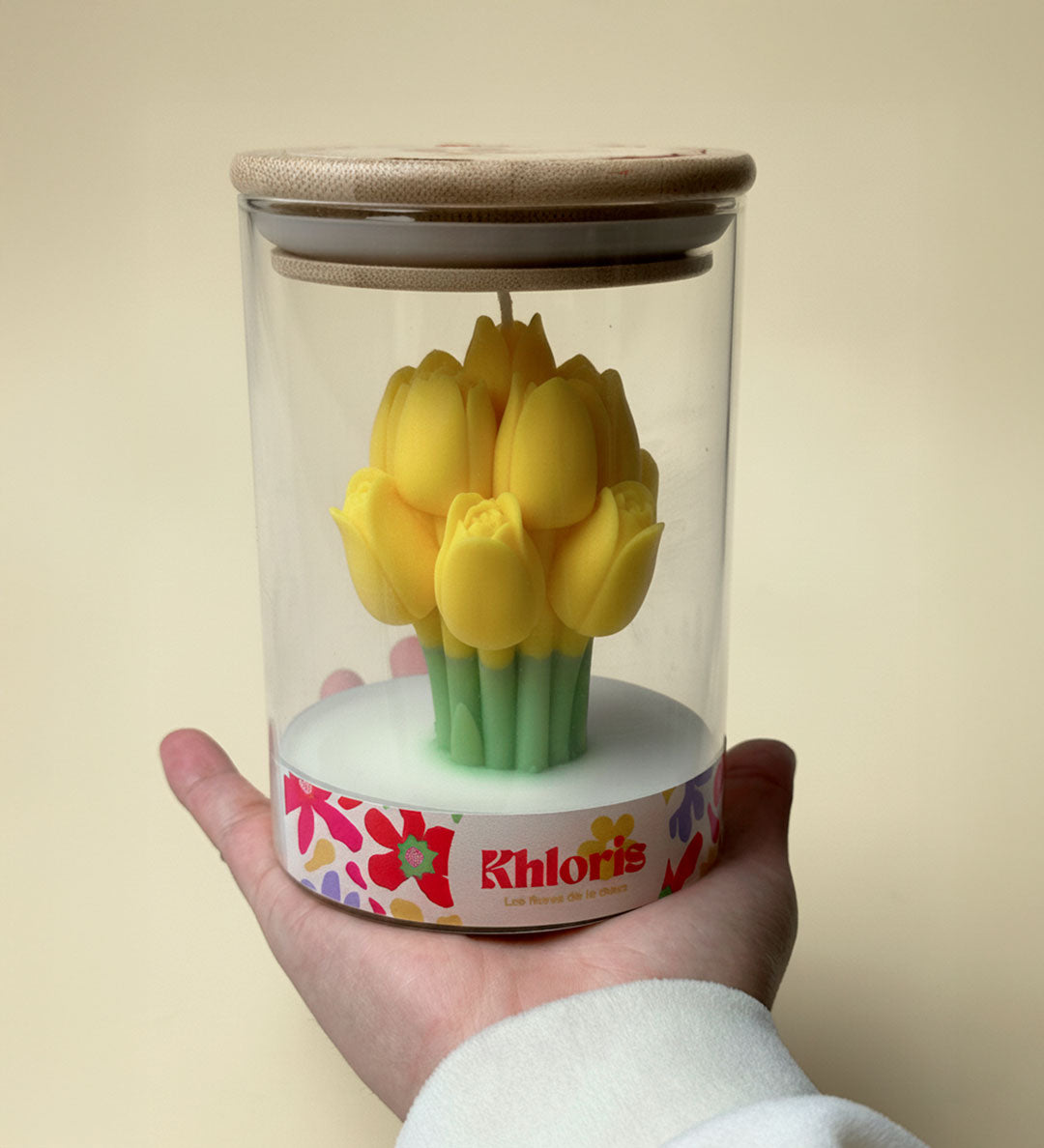 Déjate envolver por la calidez y la dulzura de nuestro Ramo de Tulipanes Amarillos, una vela hecha a mano con cera de soja natural y moldeada en forma de delicados tulipanes.