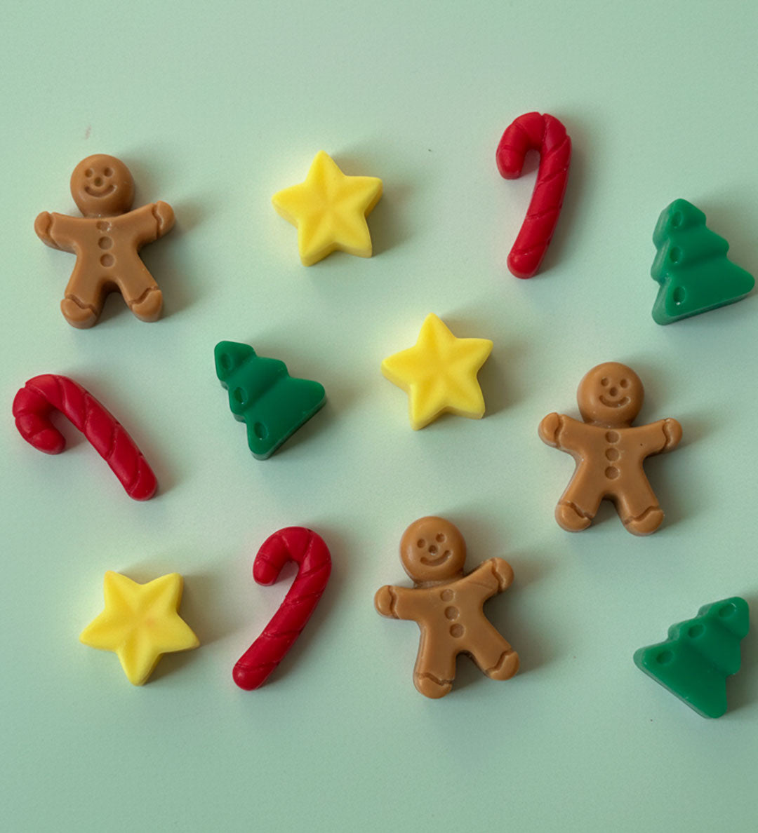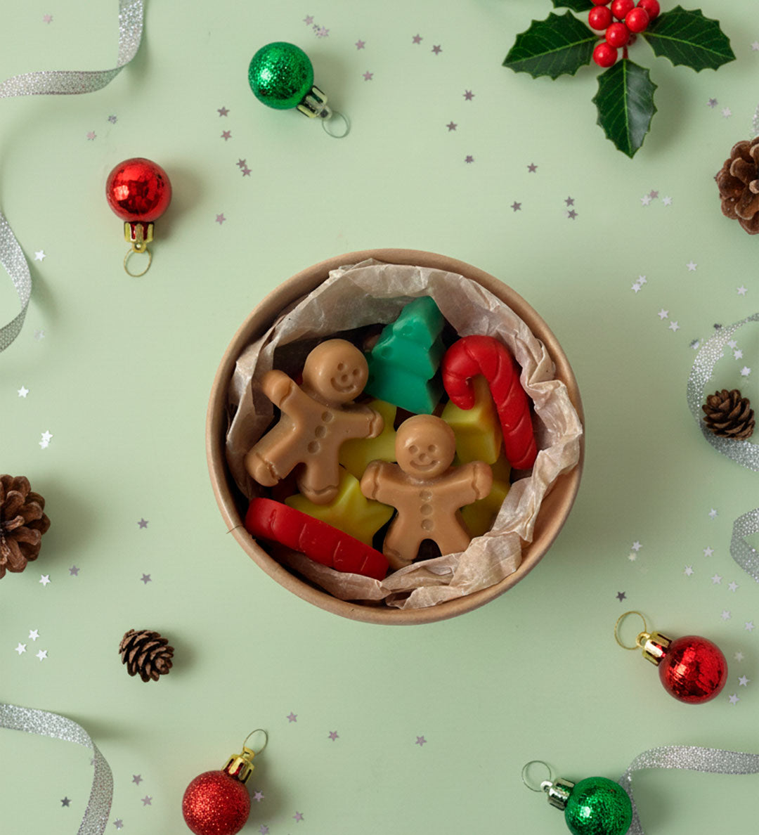 Cada contenedor incluye 60 g de pequeñas piezas aromáticas con formas tradicionales de la temporada: hombrecitos de jengibre, bastones de caramelo, arbolitos, estrellas y más. Son perfectos para usar en tu hornito aromático y para crear una experiencia sensorial envolvente.